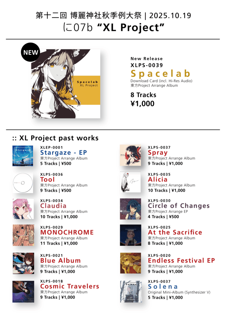 In addition to my new release “Spacelab”, I’ll also be bringing a selection of past Touhou arrangement works. If you’re interested, please feel free to stop by and say hello!