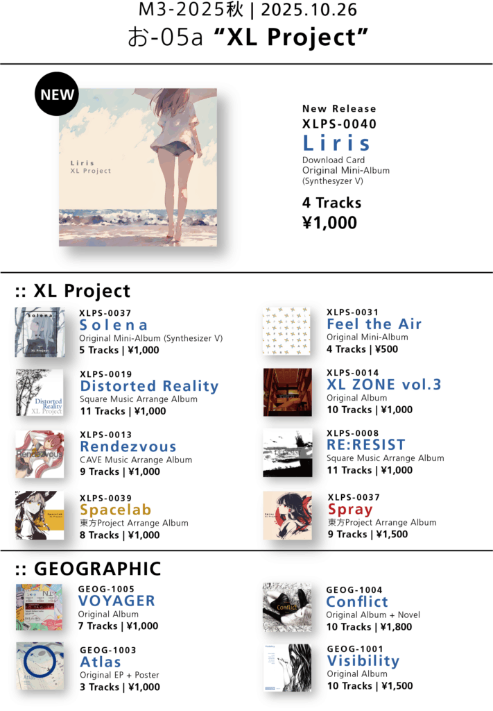 这次除了带来新专辑《Liris》,还会携带今年发行的作品、过去的原创作品,以及《GEOGRAPHIC》系列的作品。如果您感兴趣,欢迎前来摊位交流或选购!